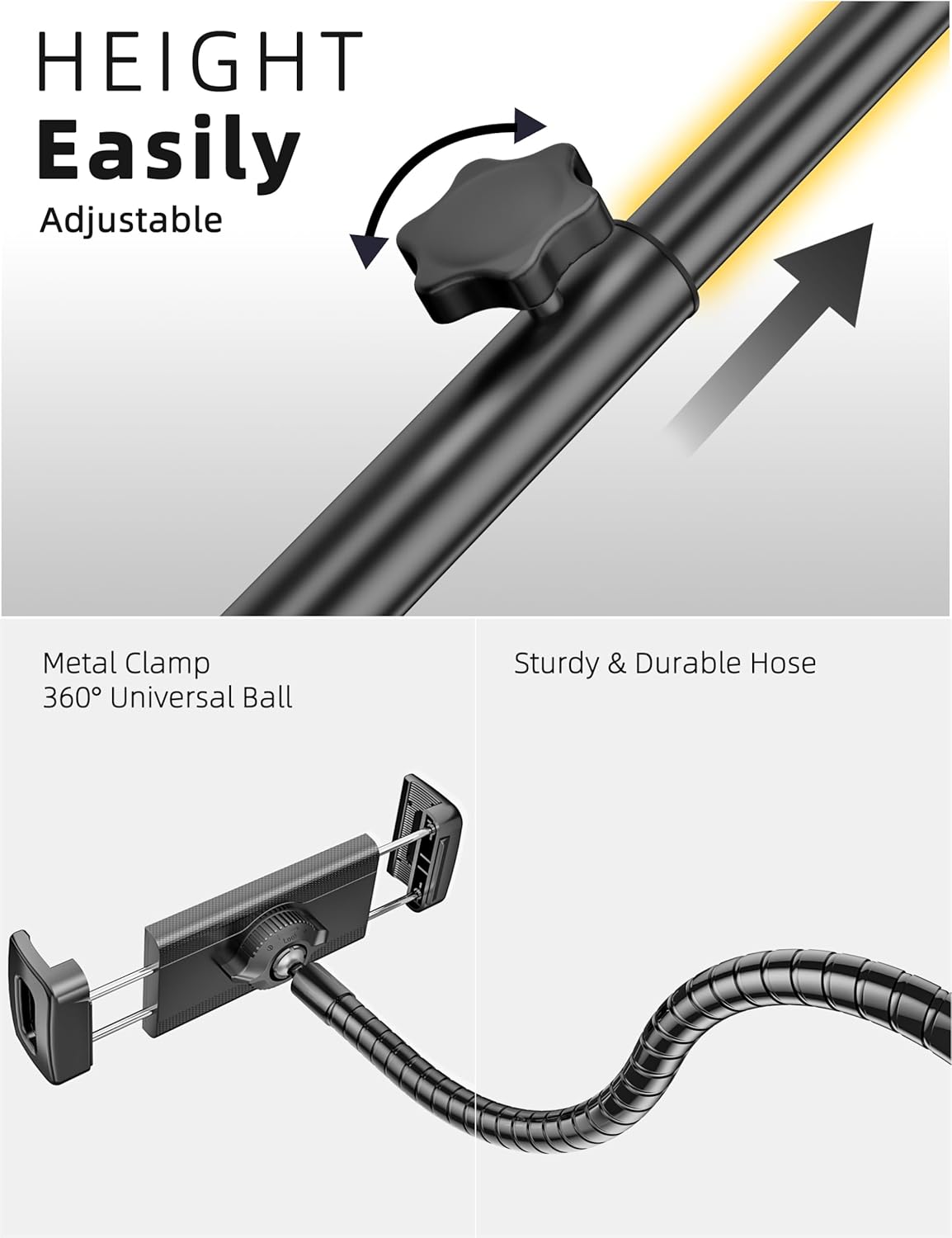 Ultra Stability: Our flexible tablet holder for bed features a double-weighted metal base, boasting a 6.6 lb weight for superior stability. The upgraded metal gooseneck arm balances flexibility with durability, ensuring long-lasting value and high cost-effectiveness